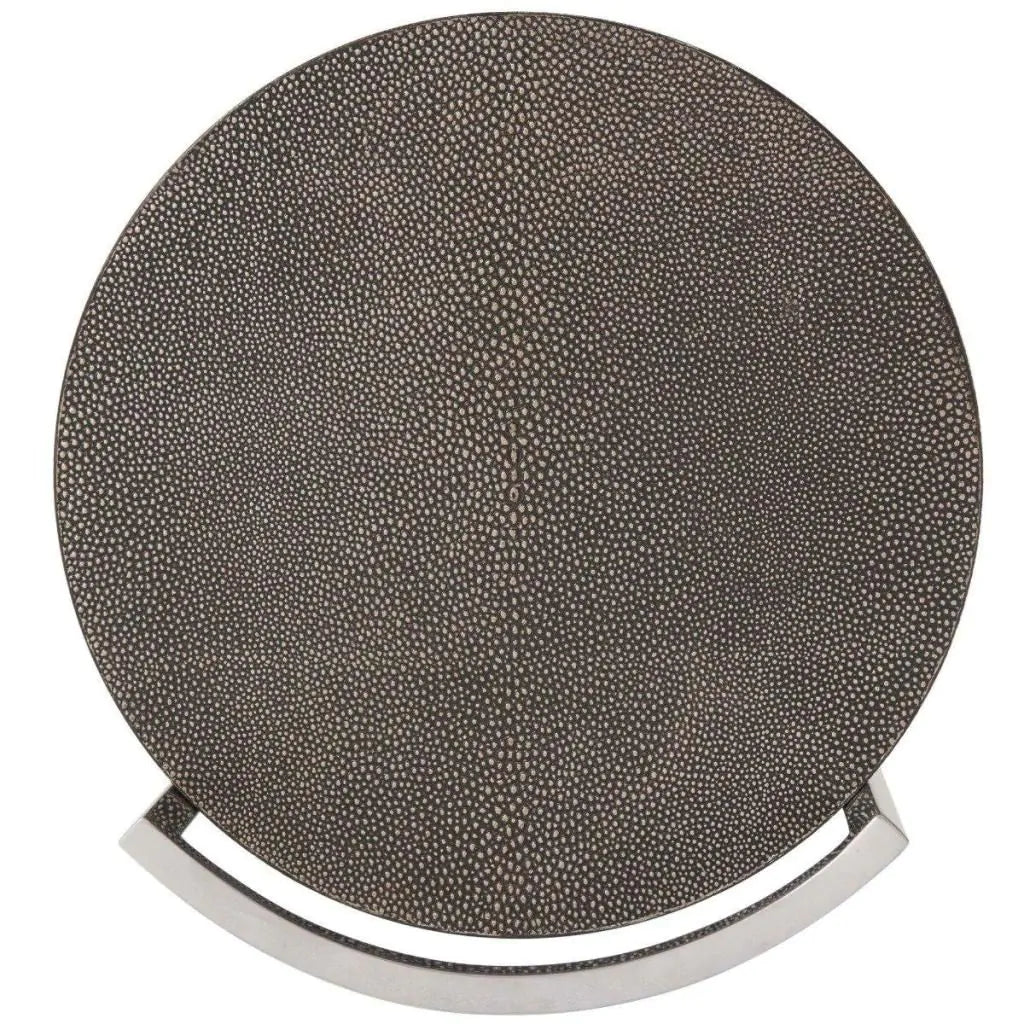 Ideal beside a reading chair or as an elegant bedside accent, this versatile table features a suspended top wrapped in shagreen-embossed leather, finished in a sophisticated Tempest tone. The top appears to float above a slender polished nickel support and circlet base, creating a light, sculptural presence that enhances its modern appeal.