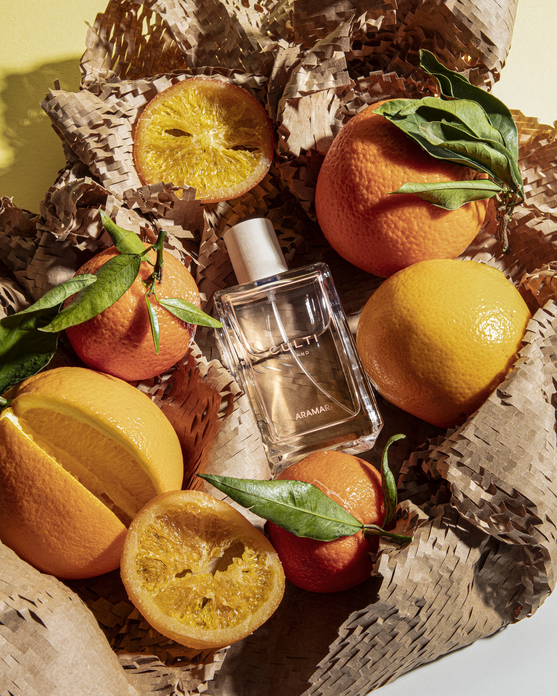 A beautifully sculpted square bottle in clear glass, finished with coloured serigraphy unique to each fragrance. Aramara is inspired by an afternoon spent in a Sicilian pastry chef’s kitchen, uncovering the complex character of bitter orange.