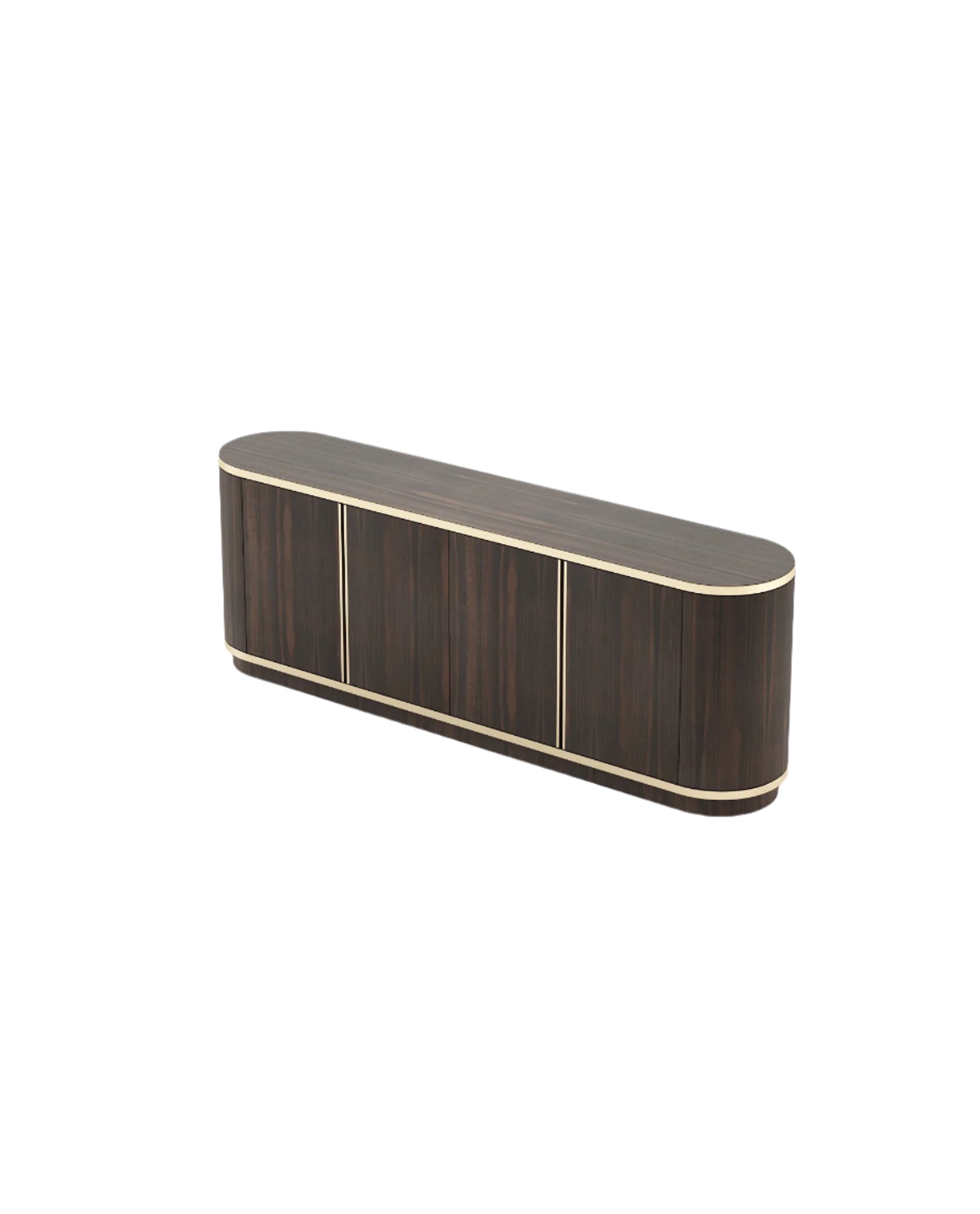 Brown is a sophisticated curved sideboard with a wooden surface, detailed metallic trims and a handmade marble top. Ideal for standout dining rooms, this meticulously crafted piece offers a contemporary look that will enhance any interior with its refined elegance.