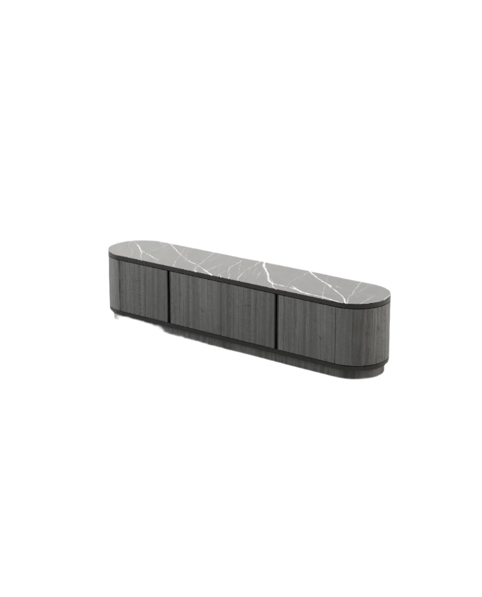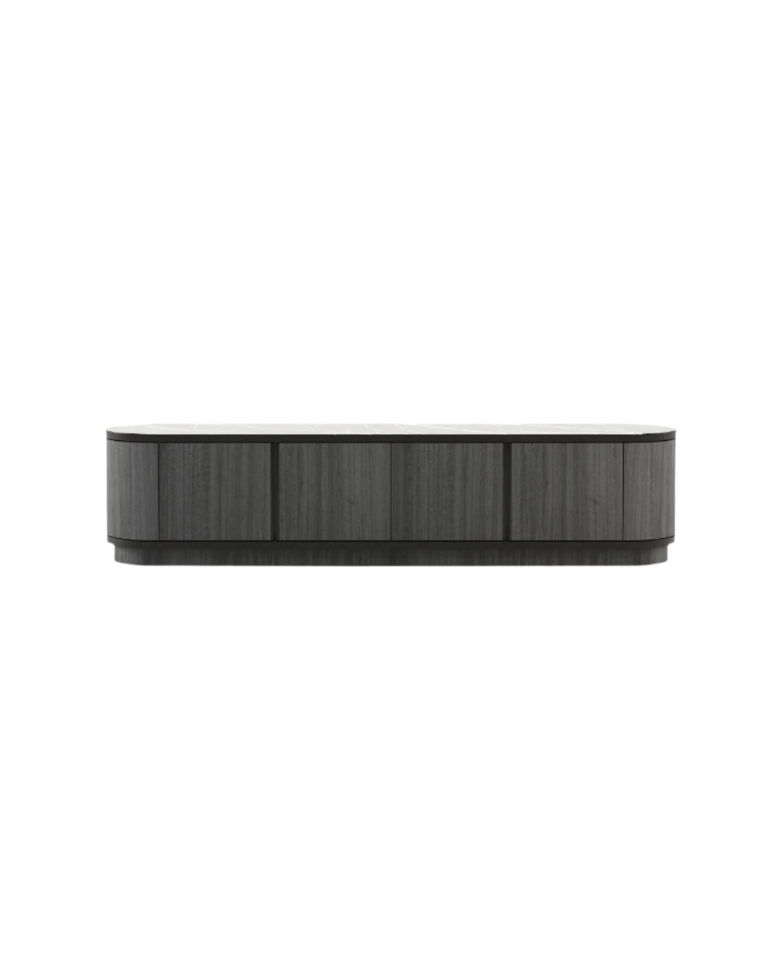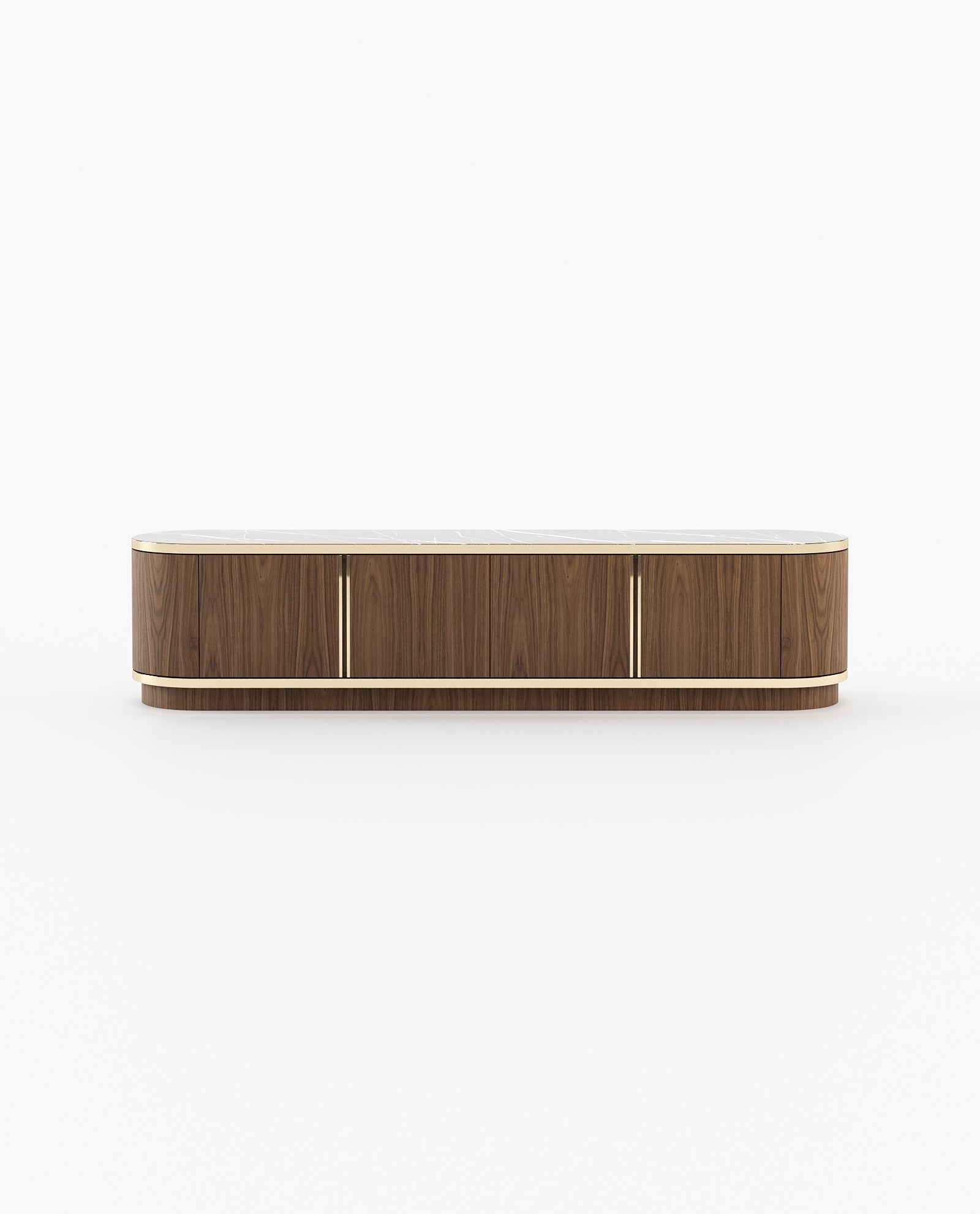 Brown is a rounded TV cabinet inspired by the 20s, featuring a wood veneer finish. This piece blends classic and contemporary styles, offering a mid-century modern look that combines the timeless charm of the past with the utility required for today's technology.