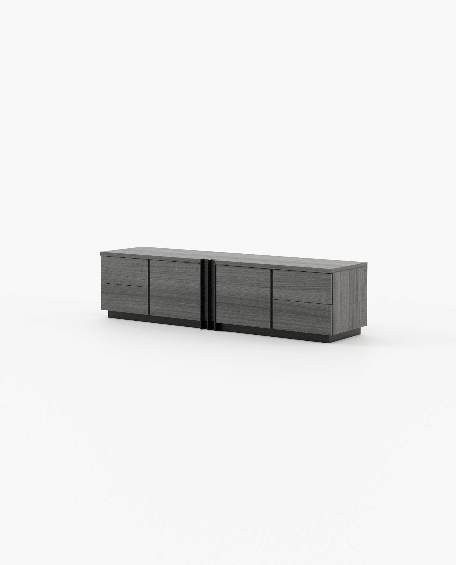 D'Arc is a distinguished wooden TV cabinet from the D'Arc collection, showcasing two drawer modules and two central doors. Its elegant wooden body and carefully selected details make it an ideal choice for enhancing any home decor.