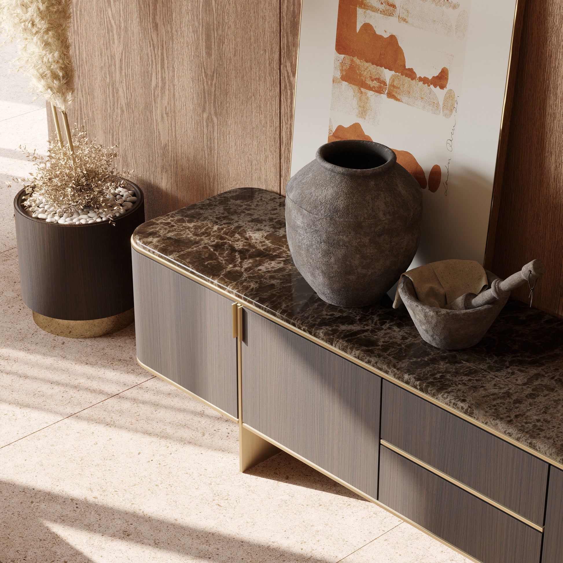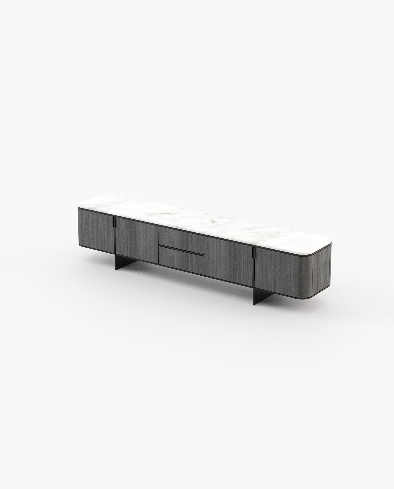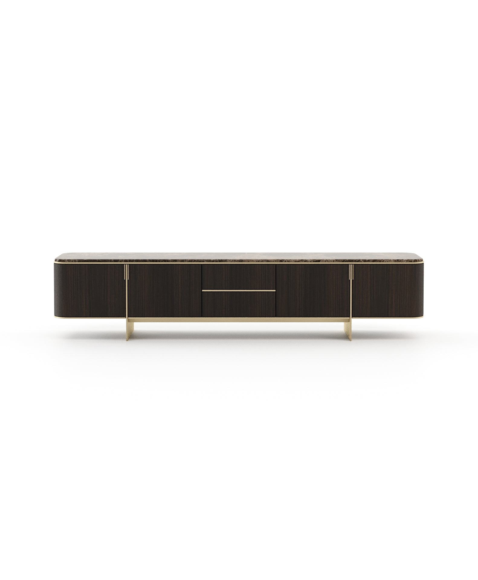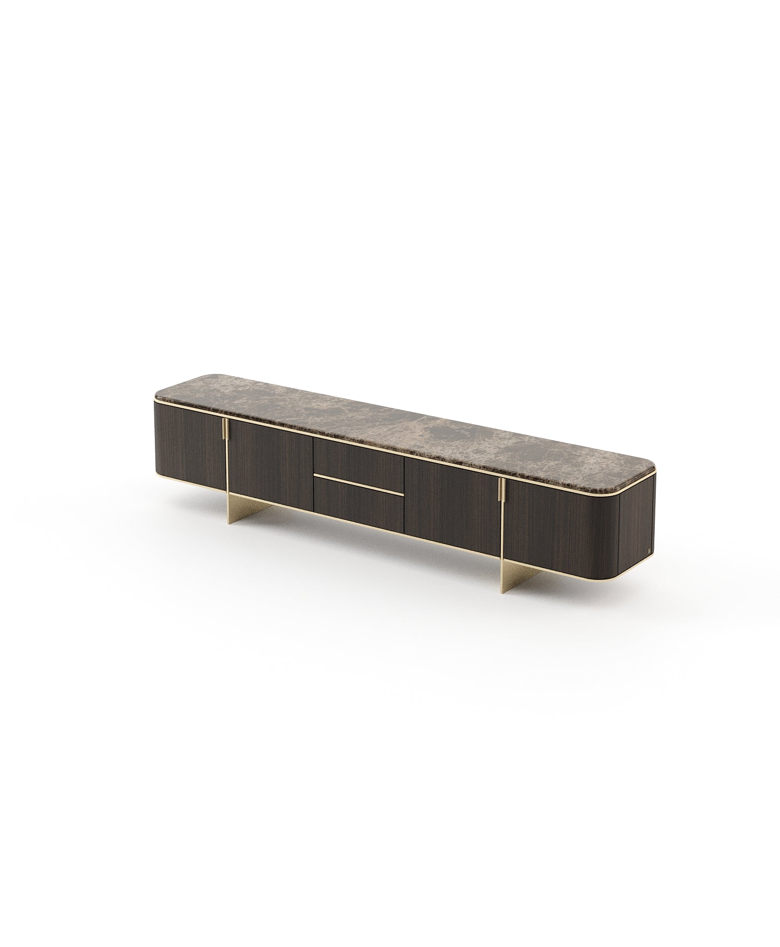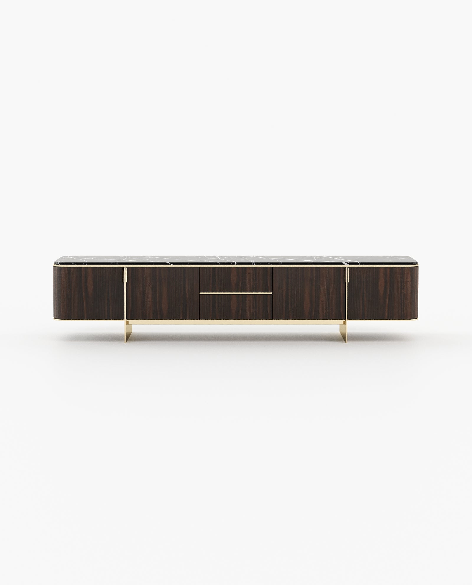 Dean is a mid-century TV cabinet with charm and sophistication. It features a stunning top available in either marble or wood veneer, supported by a wooden structure and complemented by metallic details, adding a refined touch to any living space.
