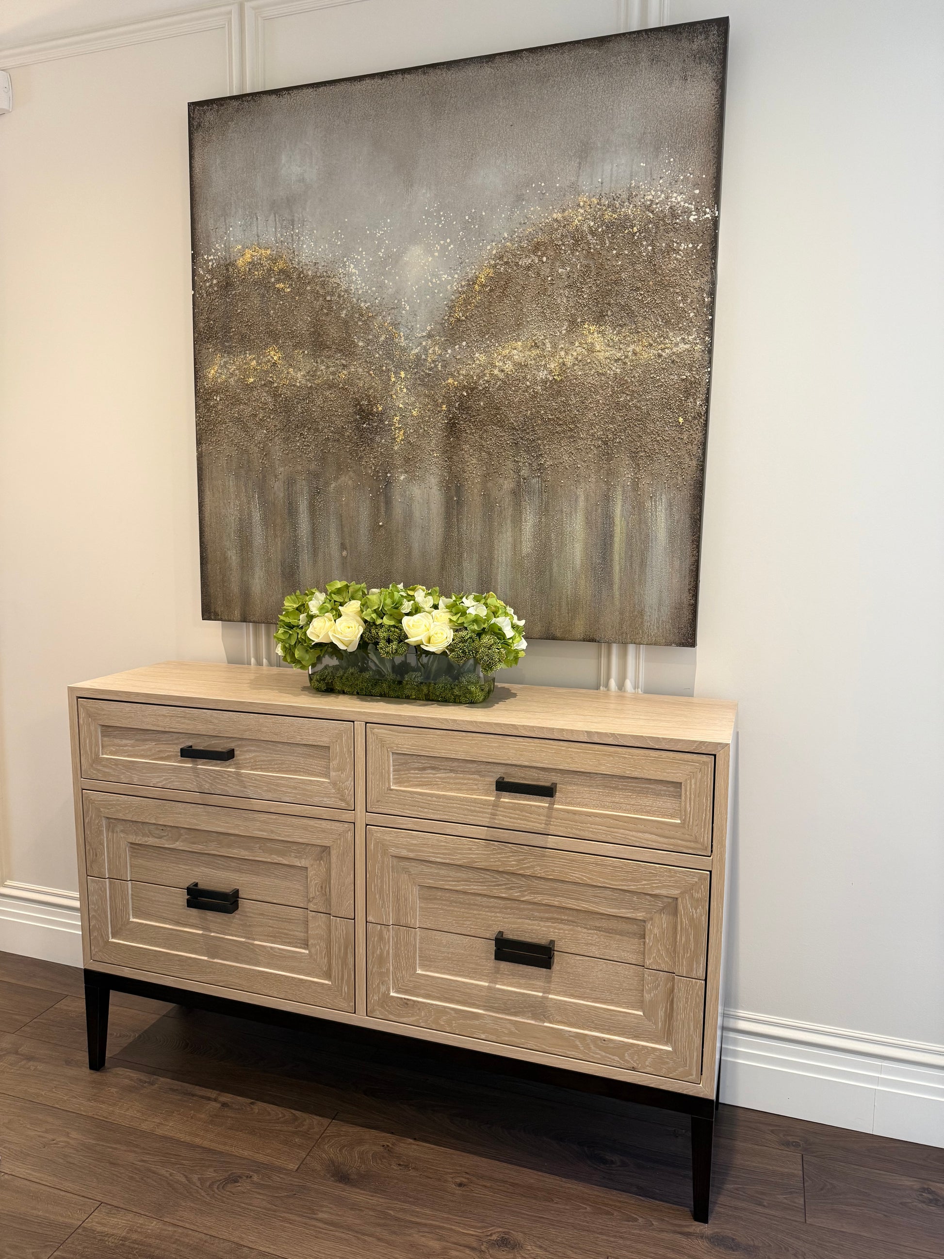 A large modern grey day oil painting typically features a contemporary and minimalist design that uses varying shades of grey to create a serene, muted atmosphere.