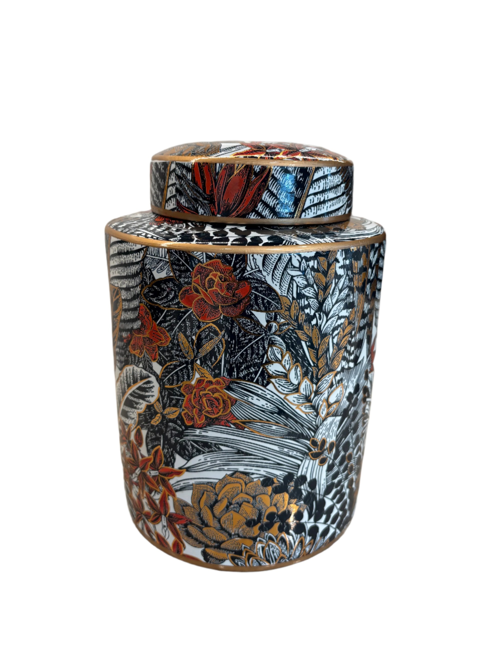 This Leaf Print Lidded Jar is a stunning fusion of nature-inspired elegance. Adorned with intricate leaf motifs, this jar features a delicate and refined print that evokes a sense of serenity and natural beauty. The smooth ceramic surface, paired with its rich, vibrant colours, gives it a timeless oriental charm