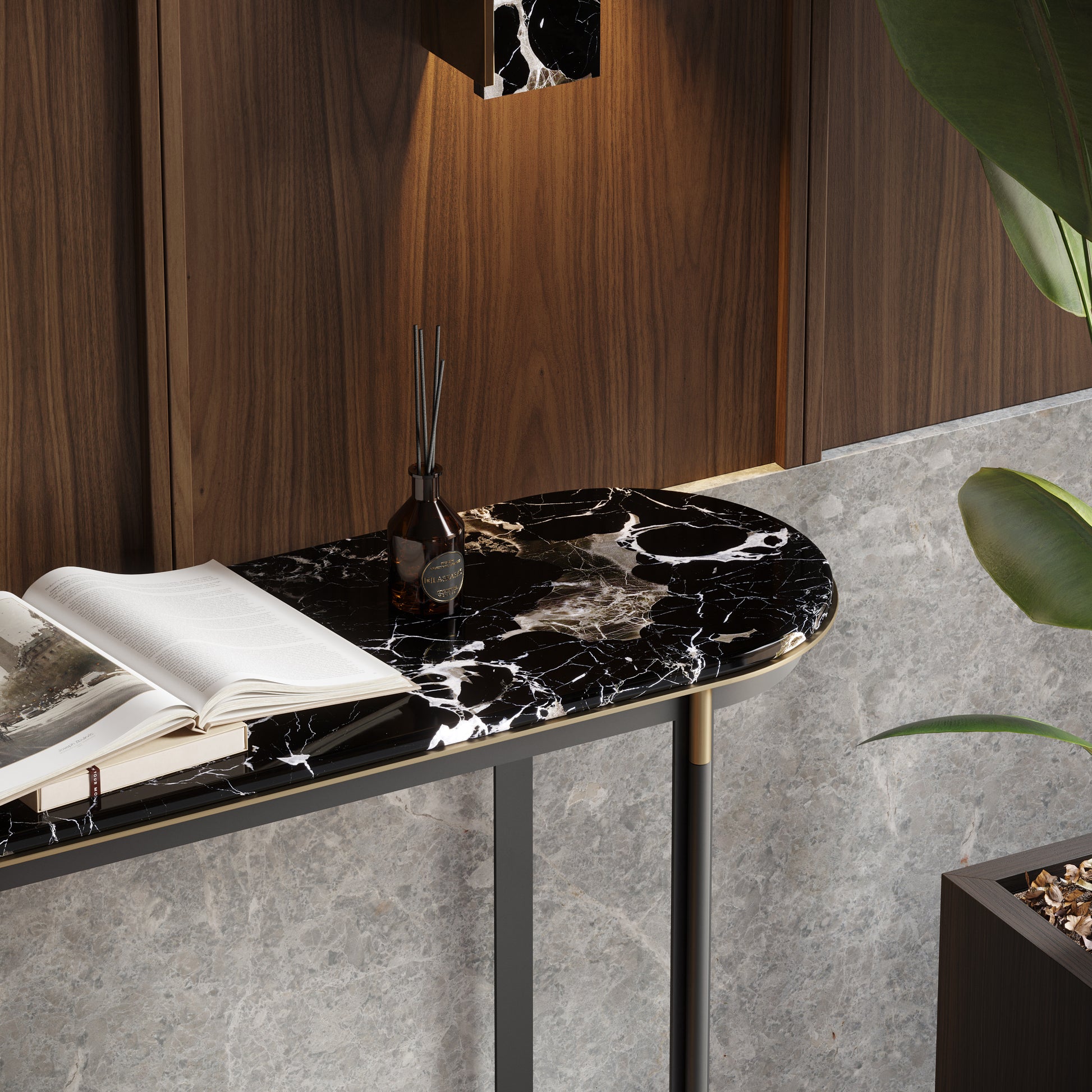 Lyssa is an iron console table that embodies the elegance of fine materials with a contemporary twist. Its iron structure contrasts beautifully with a wooden or marble top, creating an effortlessly sophisticated look. Perfect for charismatic entrance halls, the Lyssa console adds elegance and modernity to any space.