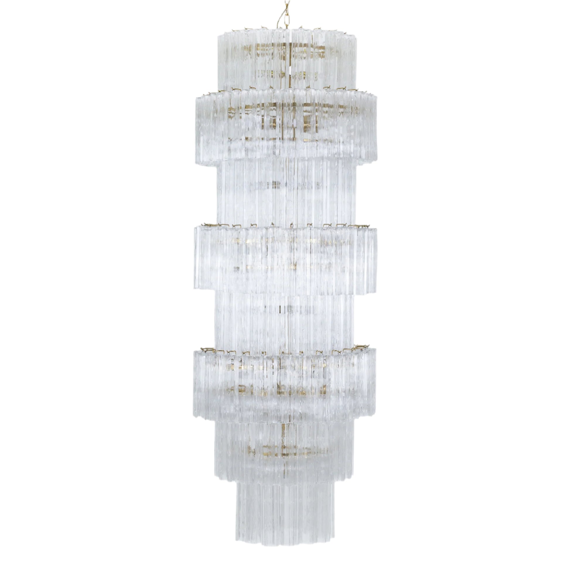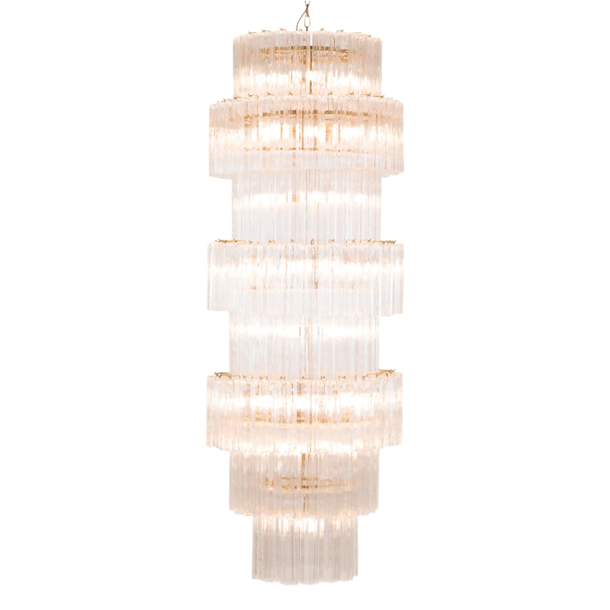 Eight amazing layers of clear glass tubes create this breath taking tiered stairwell chandelier. Each tube of textured glass is individually hung from the Satin Brass frame.