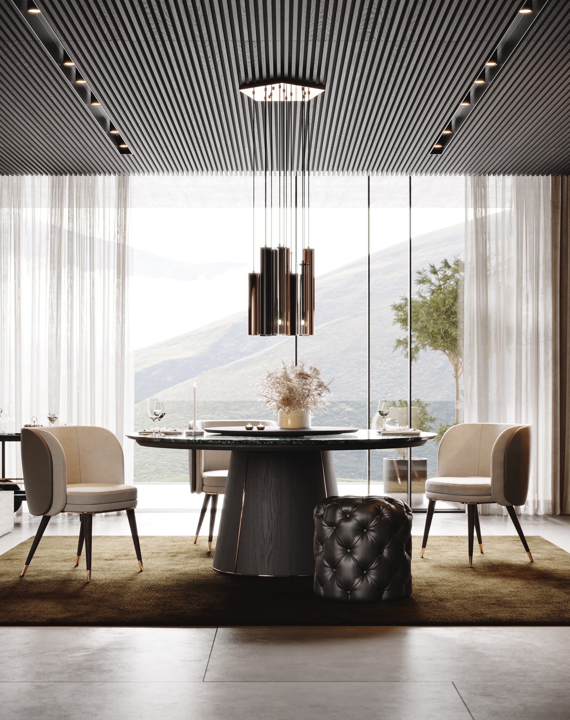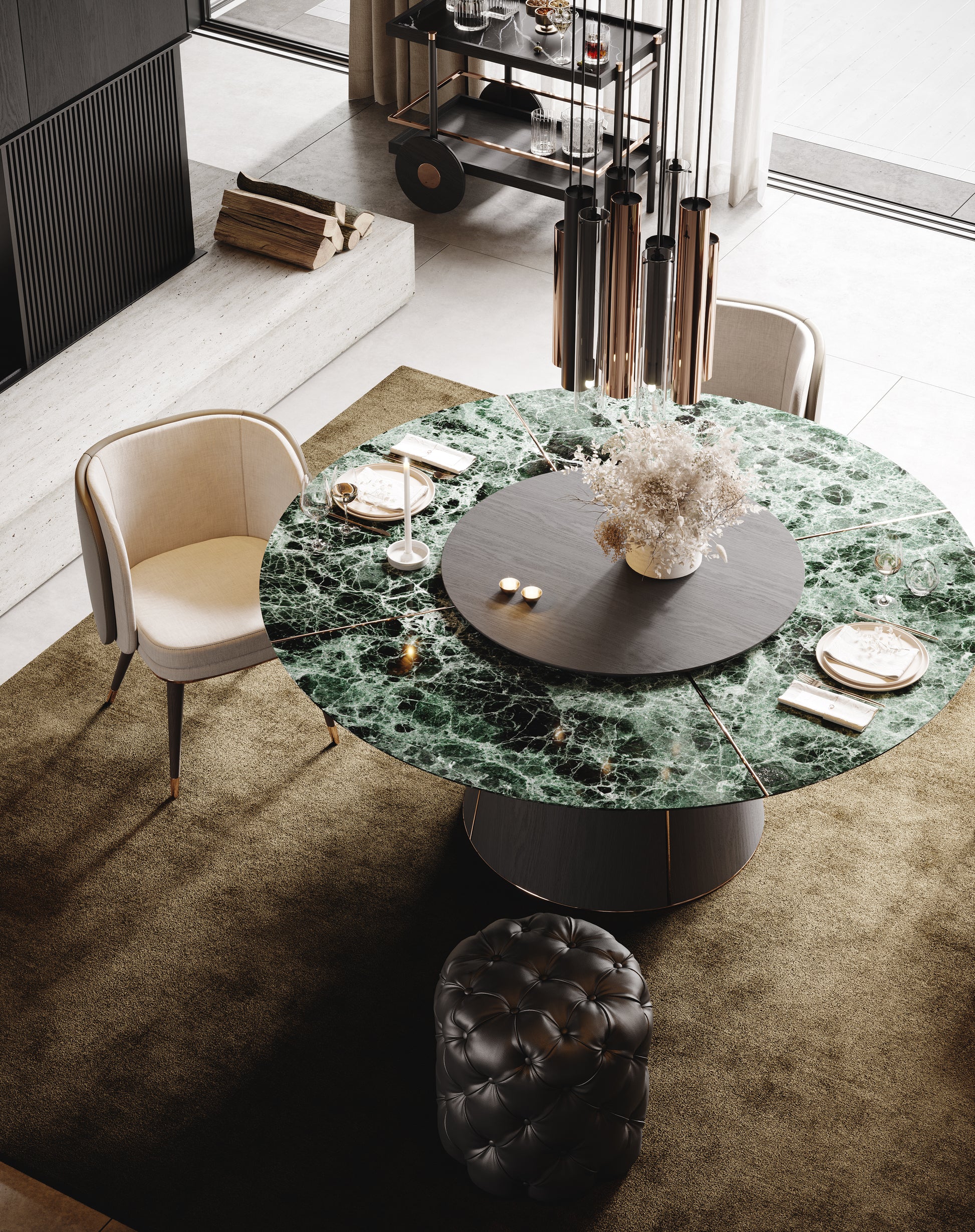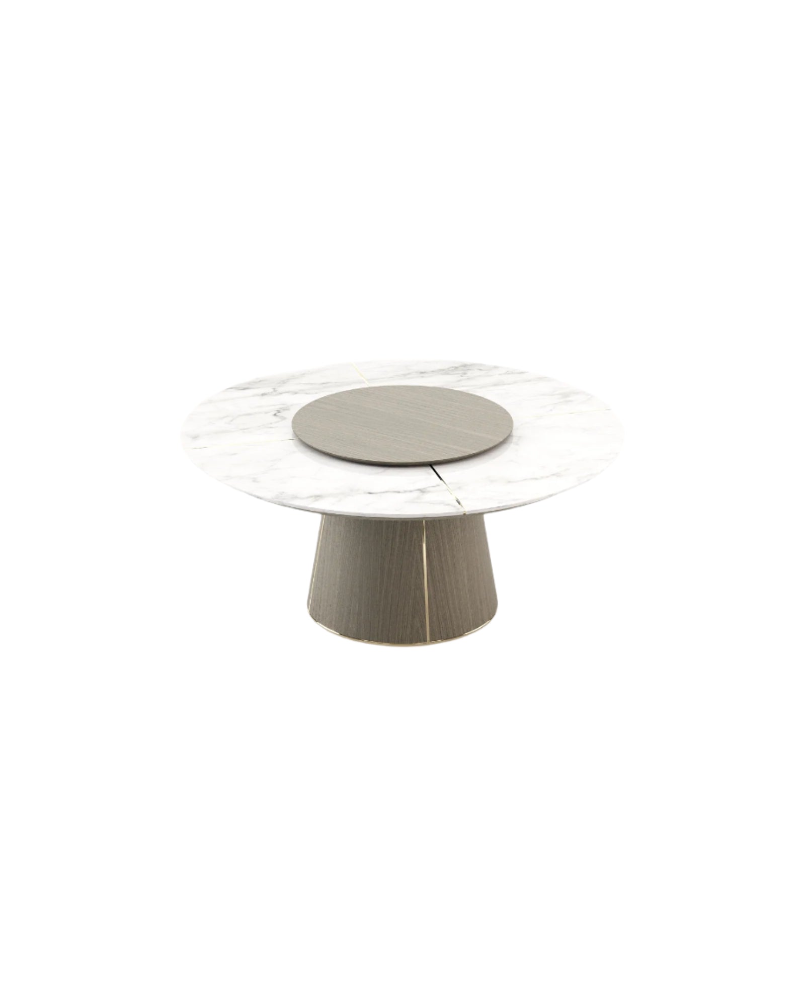 Marilyn is a captivating round dining table with a lazy Susan, designed to be the centrepiece of any high-end dining room. Featuring a unique central foot, its top is available in various materials, such as marble or wooden, offering plenty of customisation options. This versatile piece provides interior designers with a perfect blend of elegance and functionality for their projects.