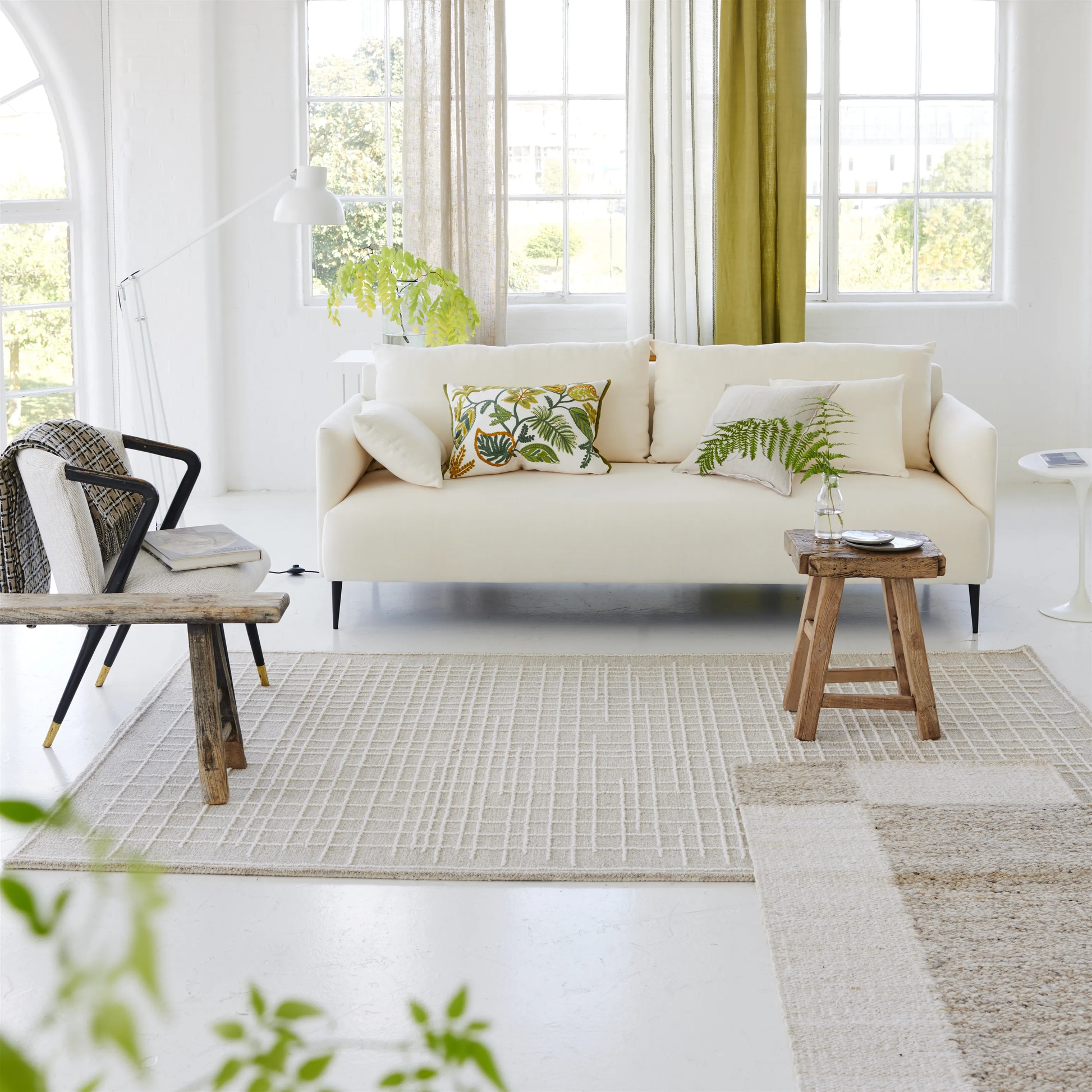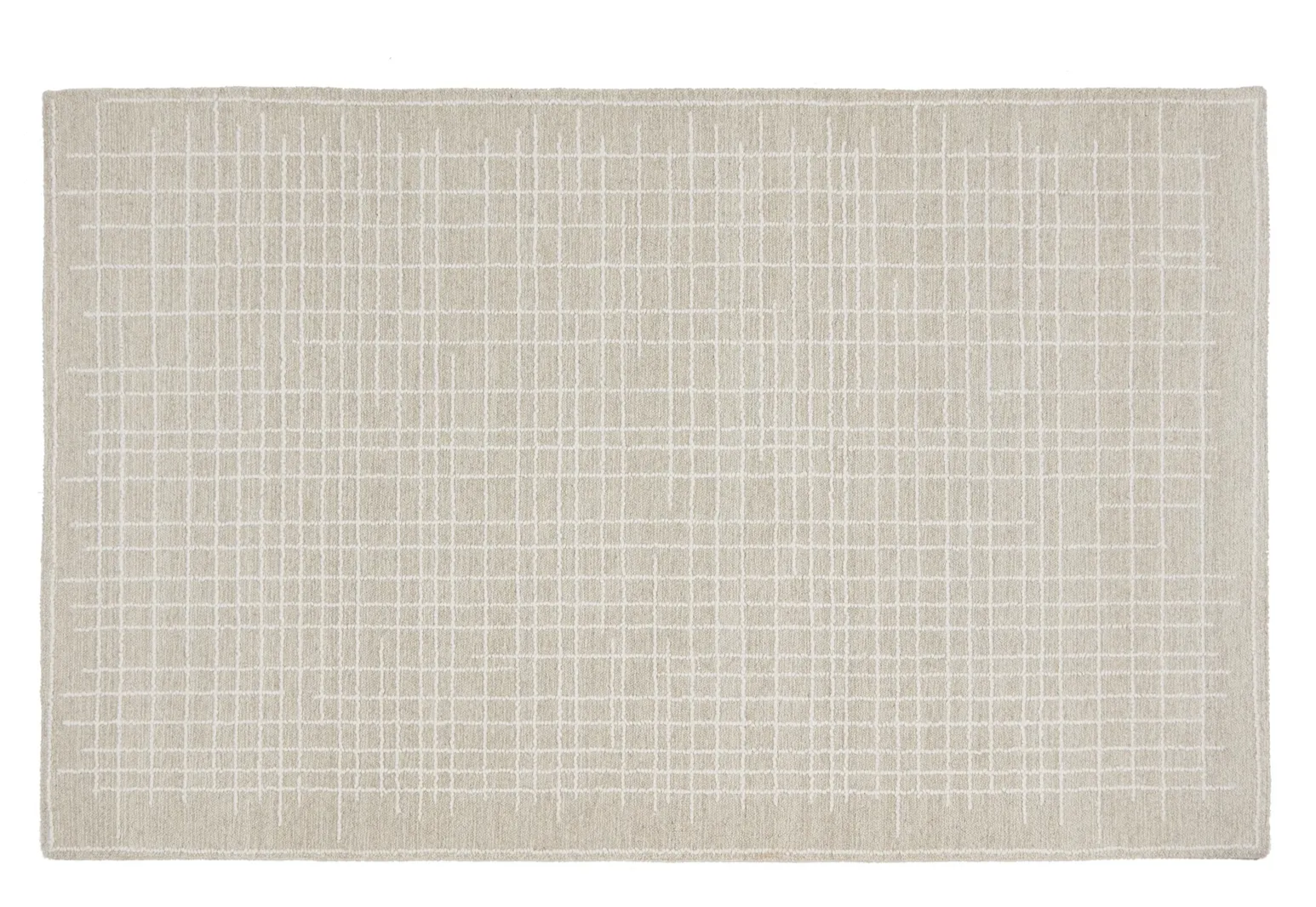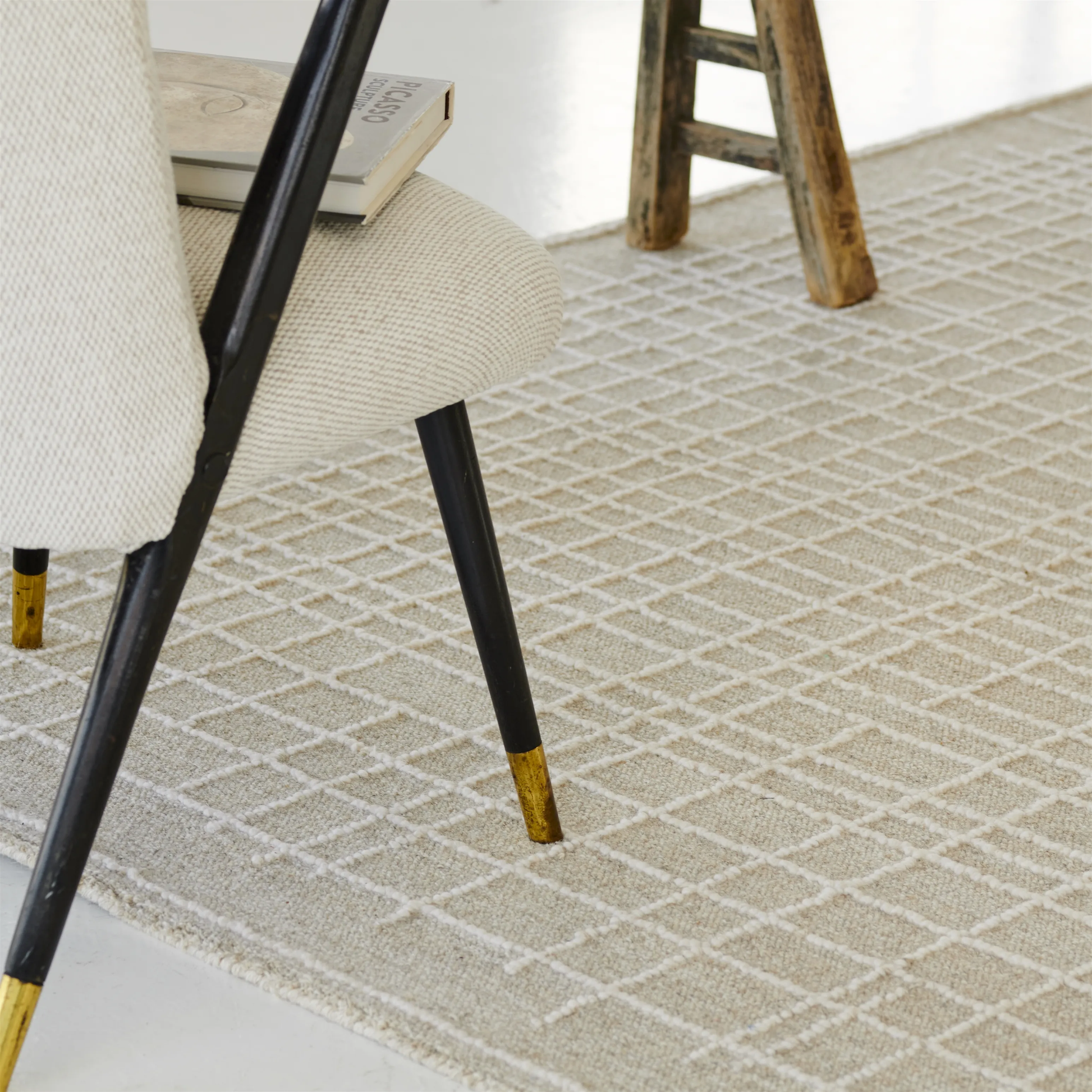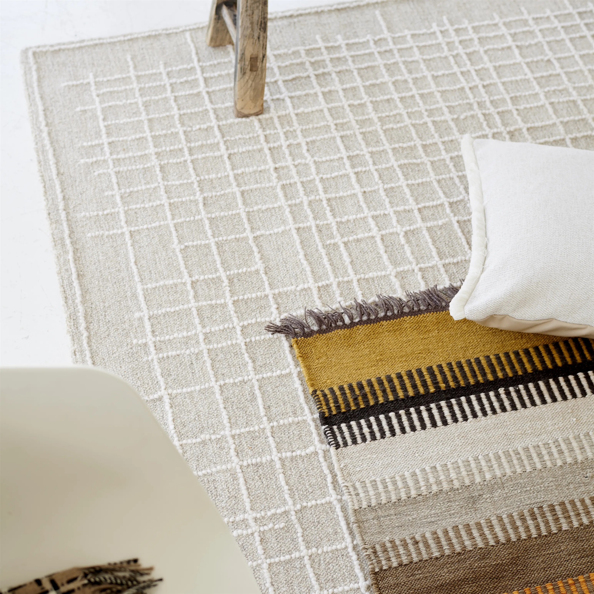 Handtufted in 100% pure wool, this sophisticated rug features a natural colourway with a contrasting ecru wool yarn tufted in a raised, interrupted grid-style check, offering a contemporary and textured feel. The rug has a cotton backing, but we still recommend using an anti-slip underlay, especially if placed on a smooth surface, to ensure added safety and stability.