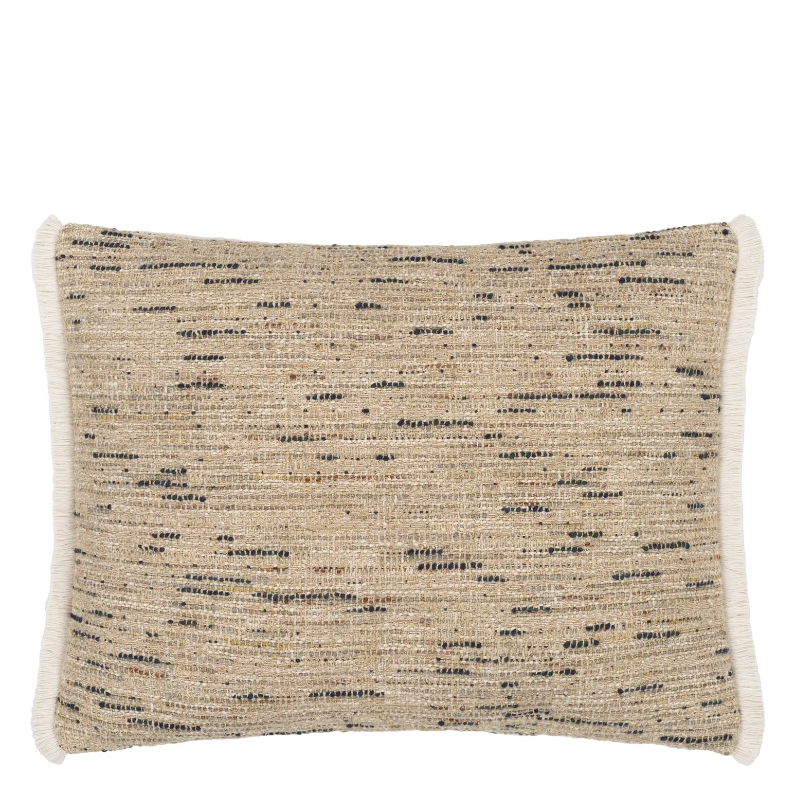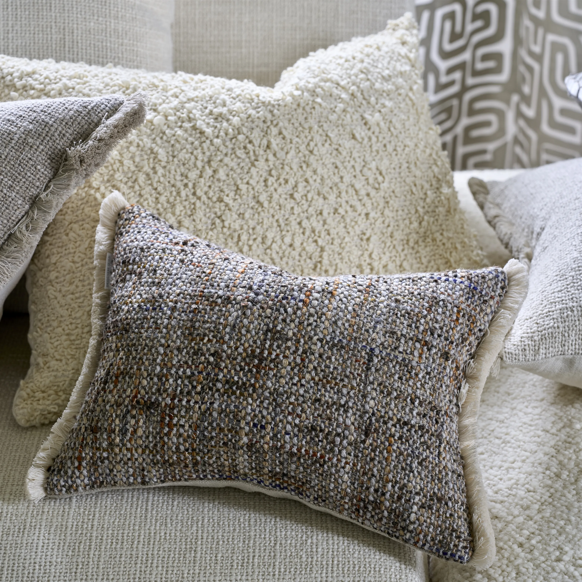 This large rectangular cushion is created with a sophisticated heavyweight textured cloth Minerve, woven with a mixture of flecked and chunky yarns in neutral, earthy shades to evoke the luxury of handwoven textiles. Paired with Tortona in ecru and finished with a luxurious brushed fringe trimming on two sides.