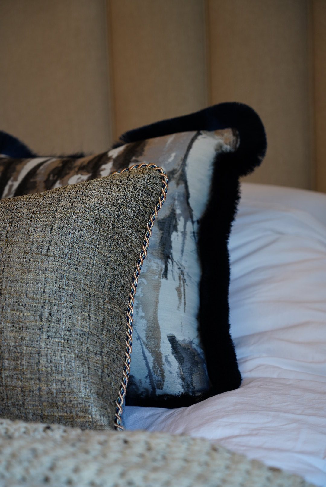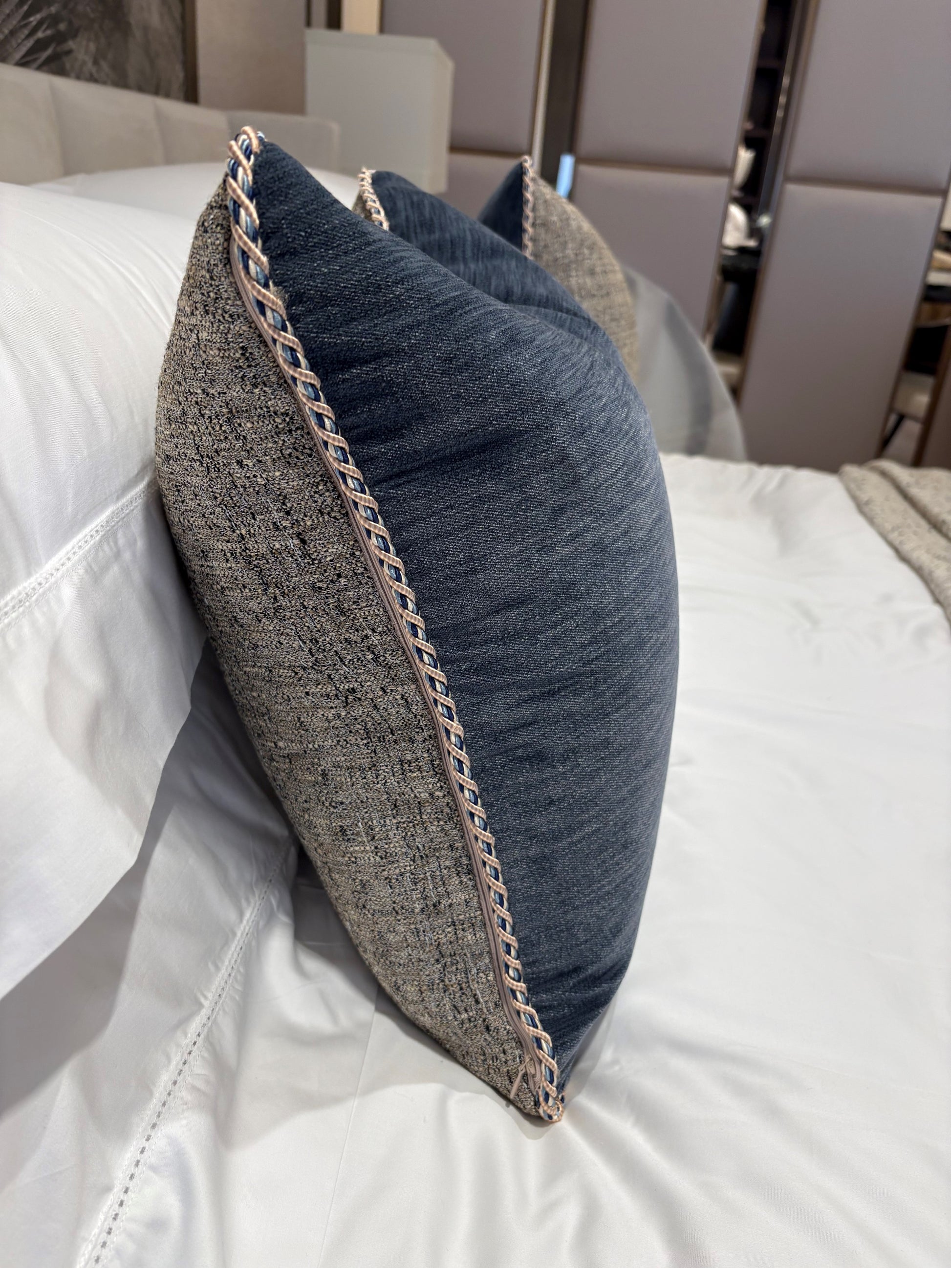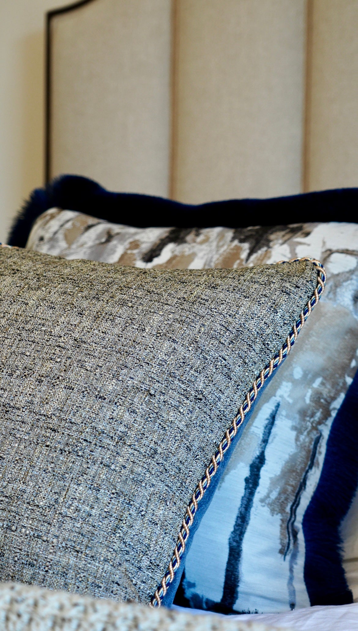 Elevate your interior with beautifully crafted bespoke cushions. Featuring a rich navy front paired with a classic tweed reverse, this cushion offers depth, contrast, and understated elegance. The design is finished with an exquisite braided gold trim, adding a subtle touch of luxury and sophistication.
