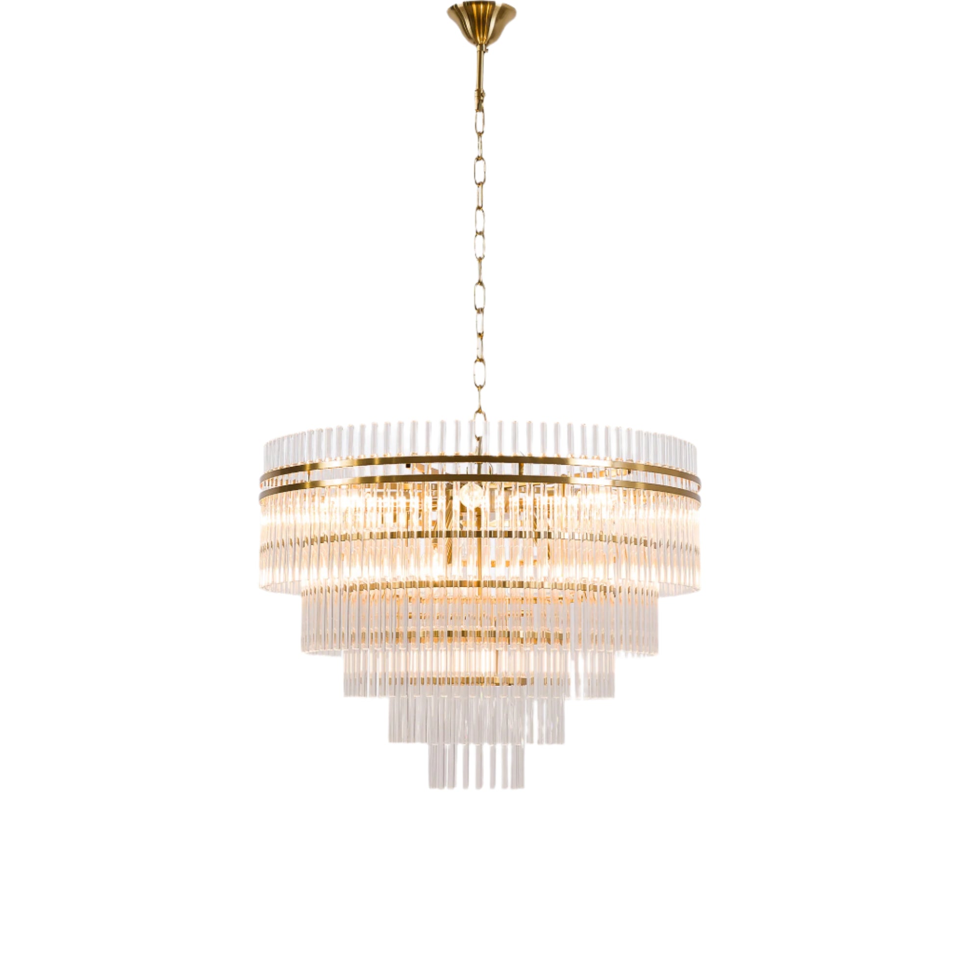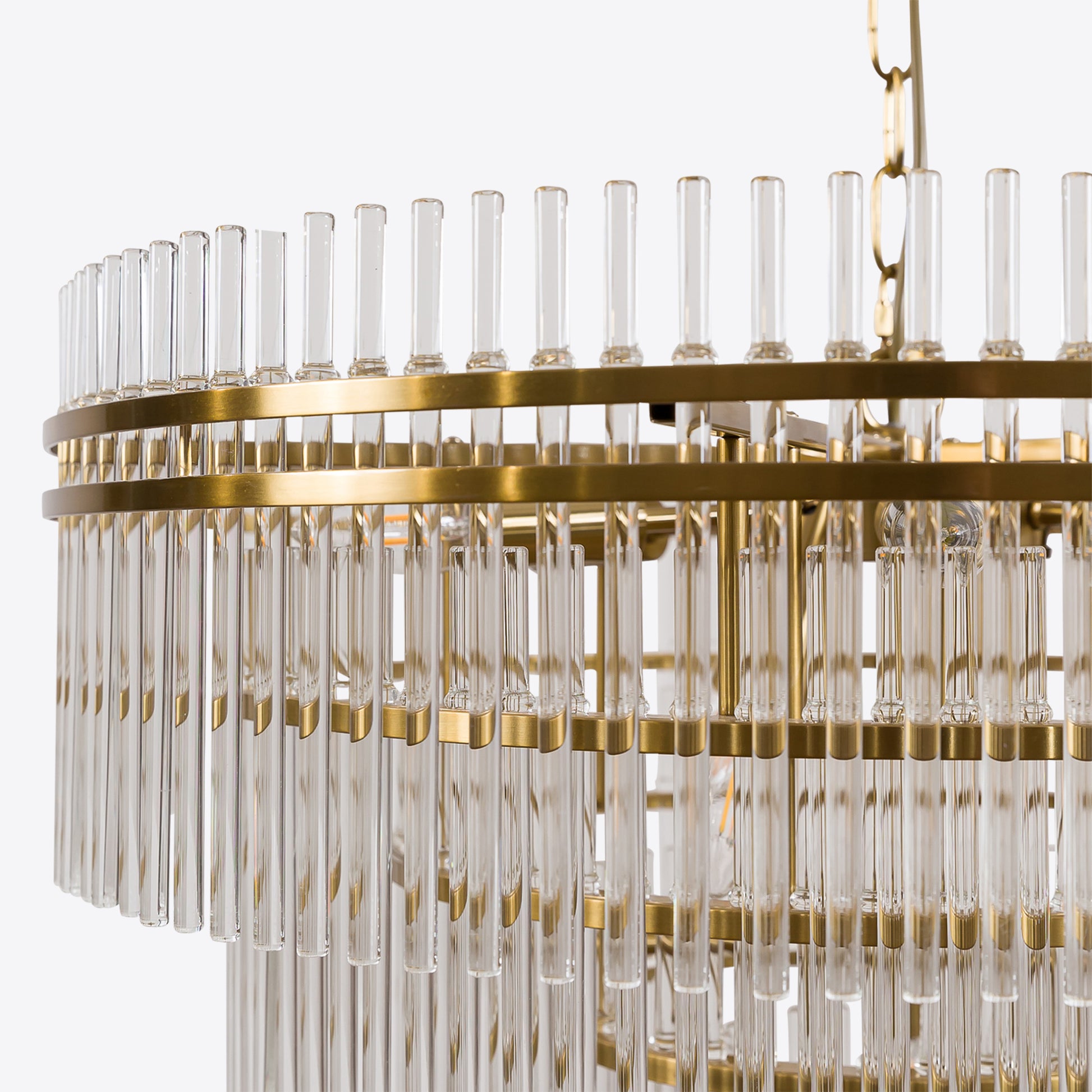 A beautiful Art Deco inspired chandelier formed of tiers of clear glass rods and sleek metalwork in a satin brass finish.