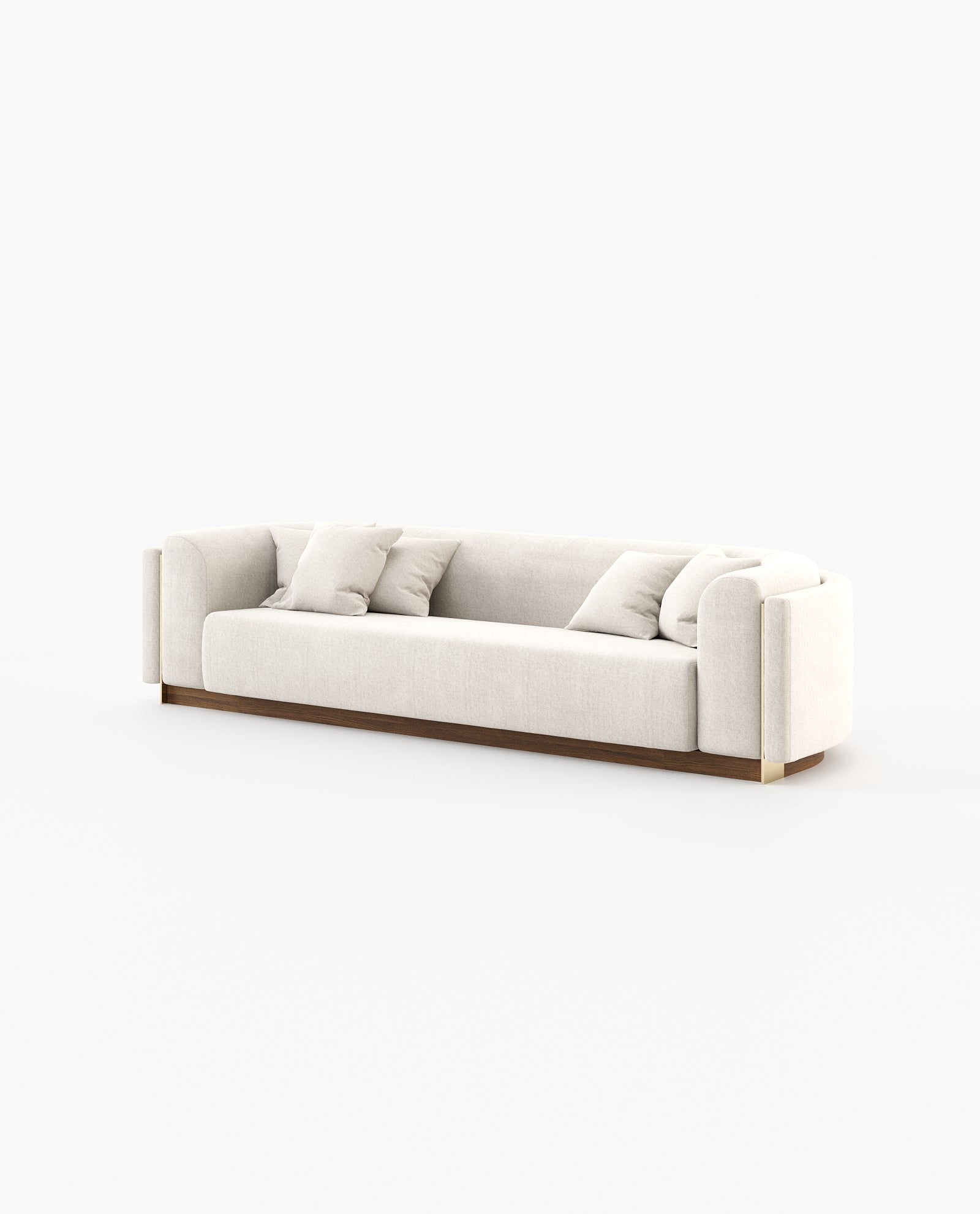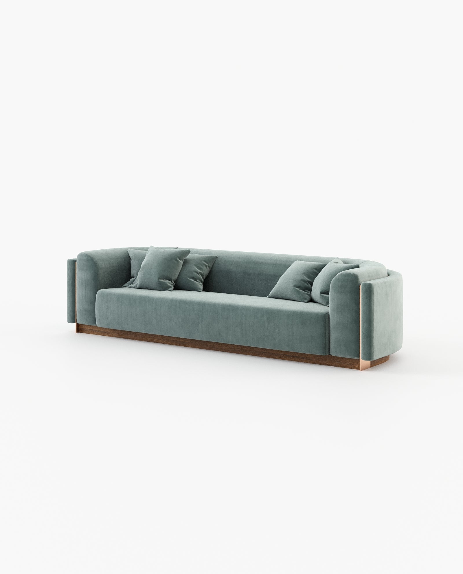 The Wellington sofa is a contemporary piece with a vintage touch, featuring a wooden base and convex edges for a comfortable and stylish addition to any open living space.